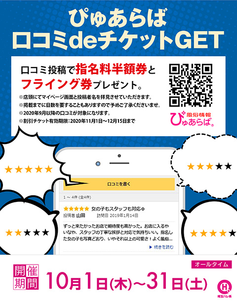口コミ投稿で指名料半額券とフライング券プレゼント。