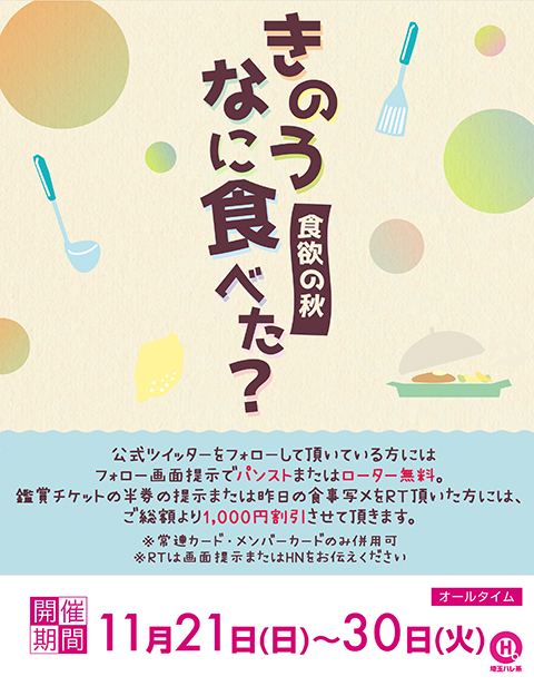 鑑賞チケットの半券の提示または昨日の食事写メをRT頂いた方には、ご総額より1,000円割引させて頂きます。