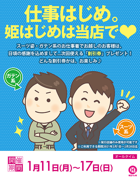 スーツ姿・ガテン系のお仕事着でお越しのお客様は、日頃の感謝を込めまして...次回使える「割引券」プレゼント!