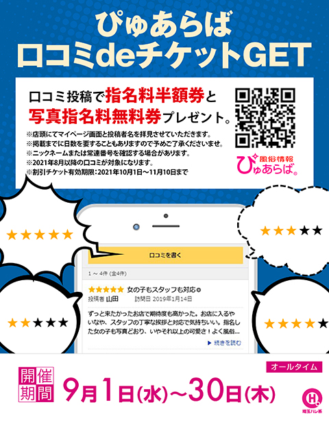 口コミ投稿で指名料半額券と写真指名料無料券プレゼント。