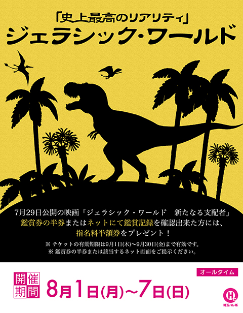 7月29日公開の映画「ジェラシック・ワールド 新たなる支配者」鑑賞券の半券またはネットにて鑑賞記録を確認出来た方には、指名料半額券をプレゼント!