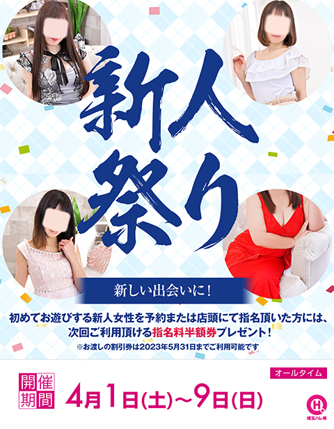 初めてお遊びする新人女性を予約または店頭にて指名頂いた方には、次回ご利用頂ける指名料半額券プレゼント!