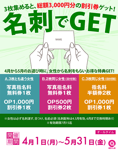 4月から5月のお遊び時に、女性から名刺をもらいお得な特典GET!