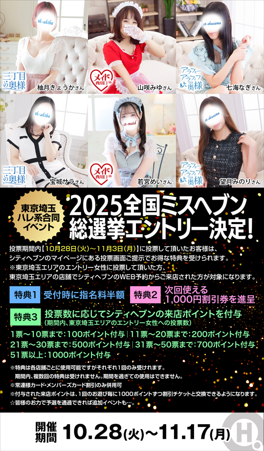 ※東京埼玉エリアのエントリー女性に投票して頂いた方、東京埼玉エリアの店舗でシティヘブンのWEB予約からご来店された方が対象になります。